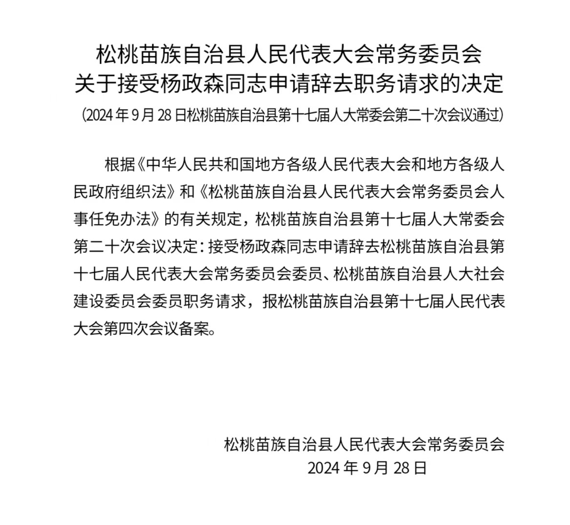 松桃苗族自治县人民代表大会常务委员会关于接受杨政森同志申请辞去职务请求的决定